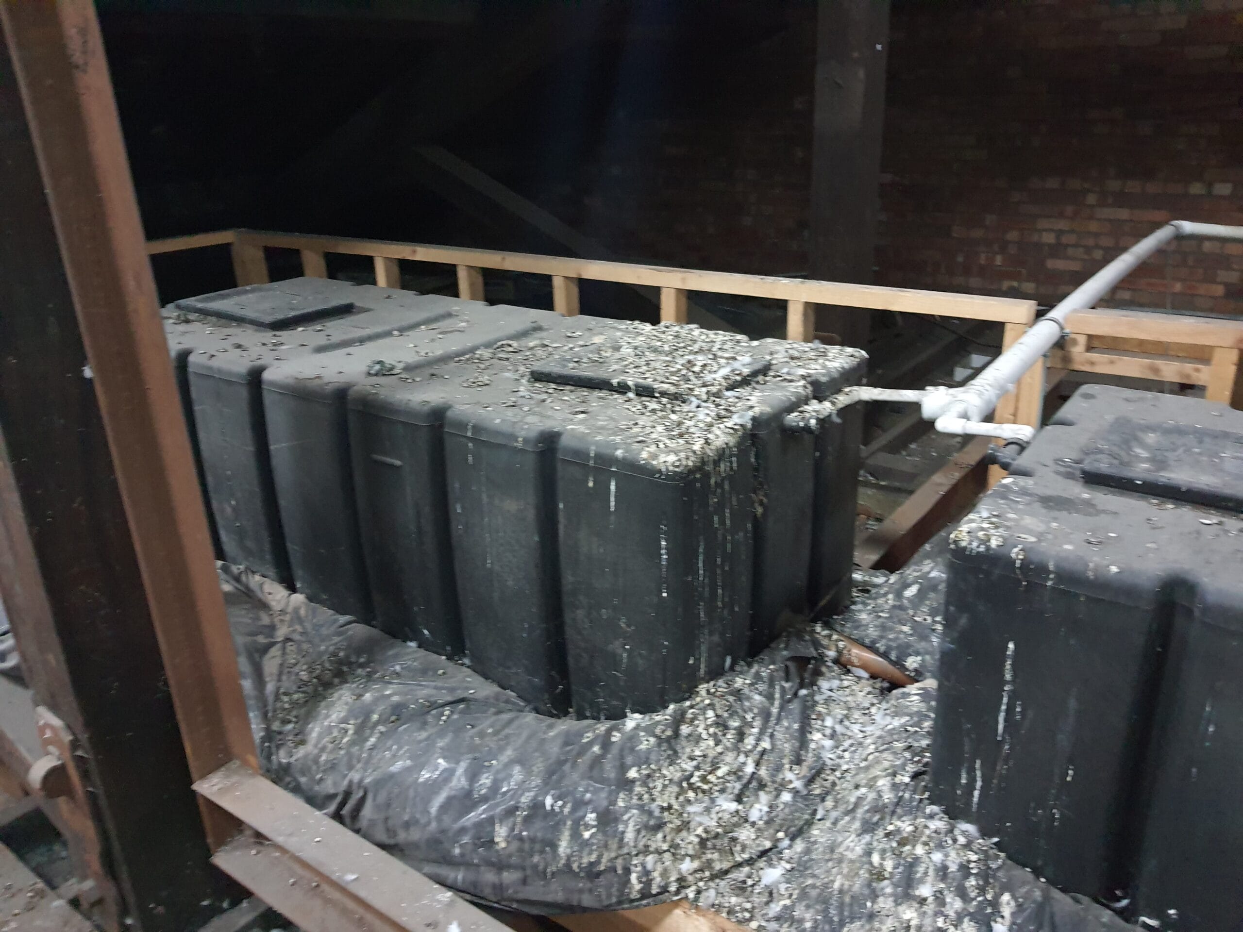 While the cold water storage tank shown here did have a lid fitted, it had clearly been neglected for a significant period of time. The heavy accumulation of bird droppings on and around the tank is not just a sign of poor housekeeping—it is a serious red flag indicating potential contamination of the water supply. This points to failures in both pest control and water hygiene management.