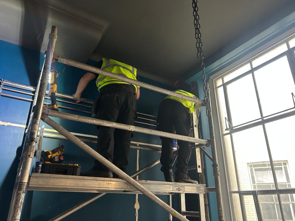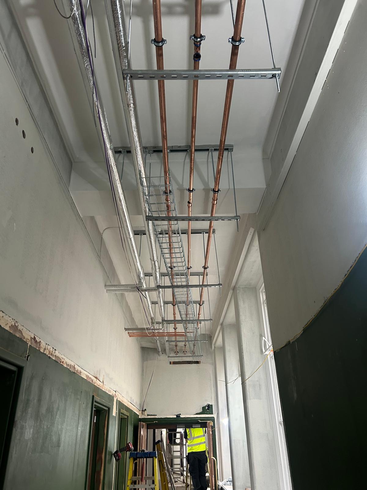 One of the most important aspects of this project has been the coordination required to route new services through an existing structure. Working within established building constraints always presents challenges, but through detailed planning, clear communication, and close collaboration with other contractors on site, the team has ensured that progress remains smooth and compliant.